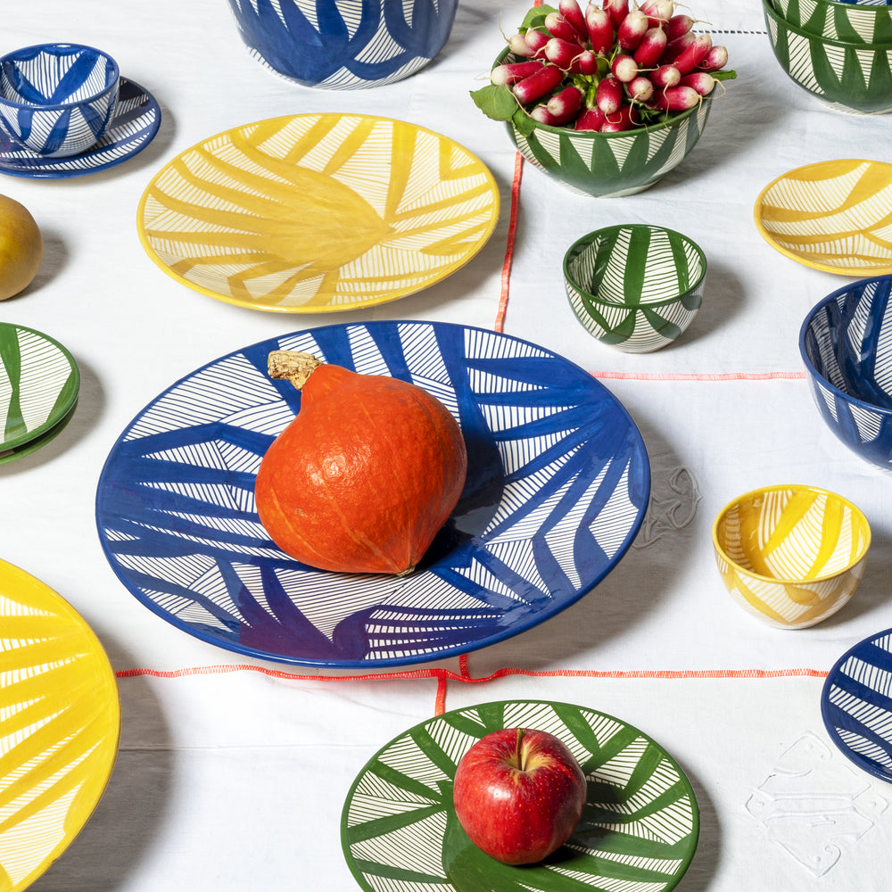Notre collection en faïence émaillée peinte à la main, aux couleurs vives et aux motifs imaginés pour cette ligne. Entièrement fabriqué à la main au Maroc.