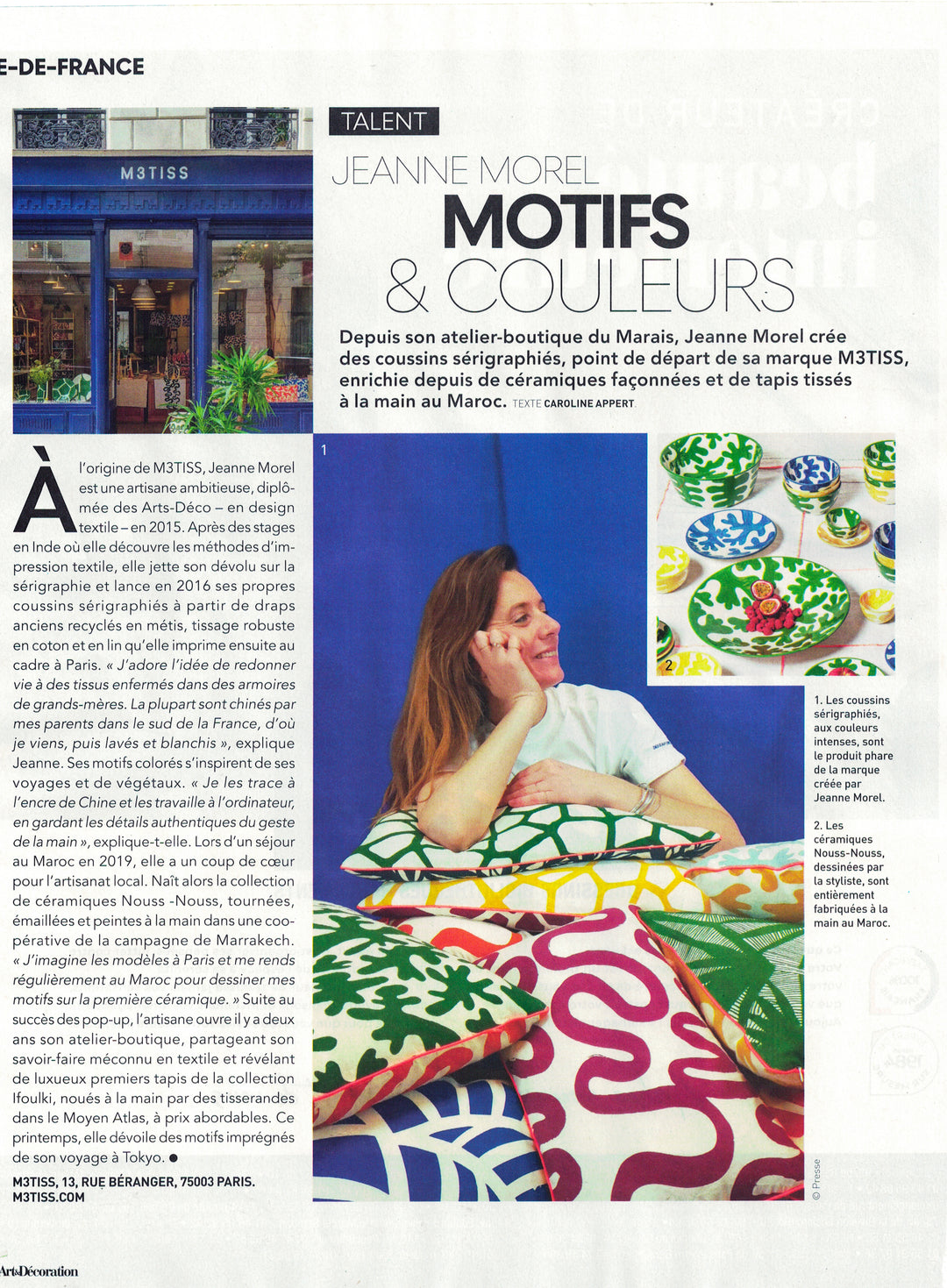 Depuis son atelier-boutique du Marais, Jeanne Morel crée des coussins sérigraphiés, point de départ de sa marque M3TISS, enrichie depuis de céramiques façonnées et de tapis tissés à la main au Maroc."