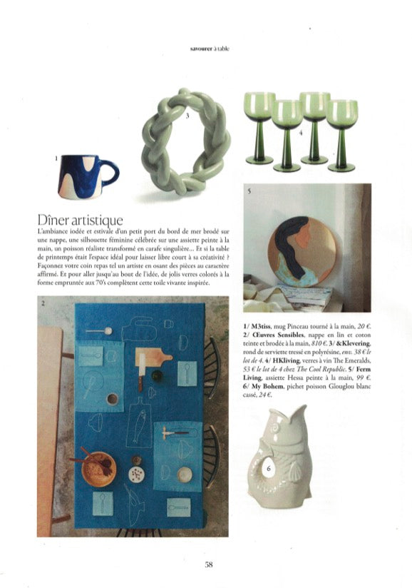 L'ambiance iodée et estivale d'un petit port du bord de mer brodé sur une nappe, une silhouette féminine célébrée sur une assiette peinte à la main, un poisson réaliste transformé en carafe singulière......."